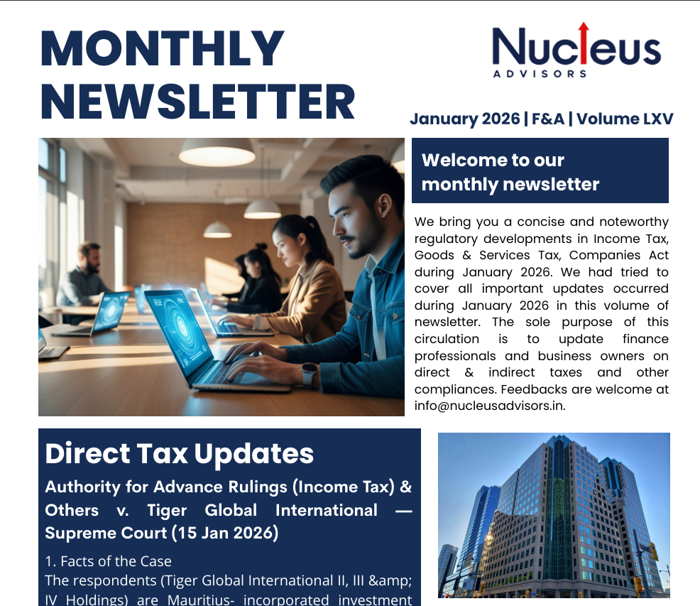 We bring you a concise and noteworthy regulatory developments in Income Tax, Goods & Services Tax, Companies Act during December 2023. We had tried to cover all important updates occurred during December 2023 in this volume of newsletter. The sole purpose of this circulation is to update finance professionals and business owners on direct & indirect taxes and other compliances. Feedbacks are welcome at info@nucleusadvisors.in.